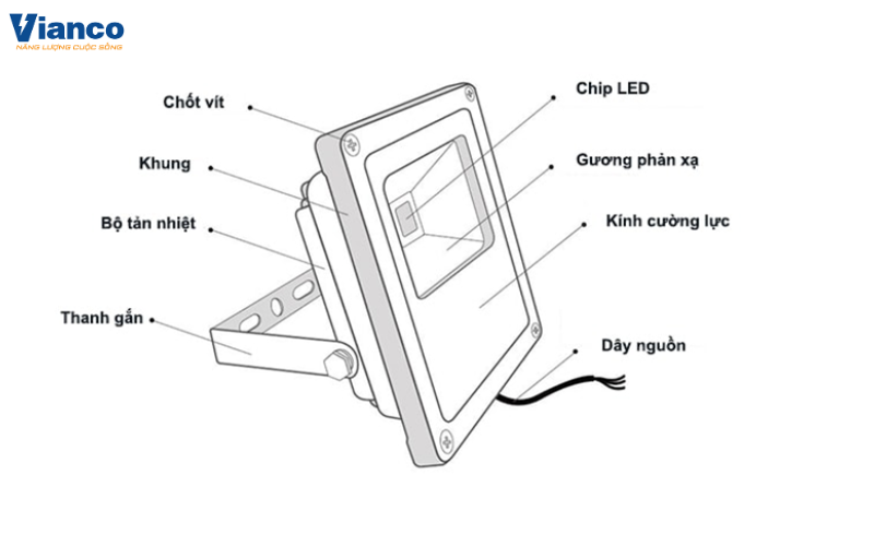 Chip LED: là bộ phận quan trọng phát ra ánh sáng của đèn. Các loại đèn pha thường sử dụng chip LED SMD và COB để đảm bảo độ bền và tuổi thọ cao. Vỏ đèn: thường được làm bằng nhôm đúc liền khối và được sơn tĩnh điện để chống lại sự ăn mòn của môi trường.Mặt kính: được làm bằng thủy tinh chịu nhiệt để đảm bảo khả năng chịu đựng nhiệt độ. Vít đèn bằng inox chống gỉ: cố định mặt kính và khung đèn. Thanh gắn: giúp cố định đèn trên bề mặt lắp đặt.Van cân bằng 1 chiều: có tác dụng cân bằng áp suất trong và ngoài đèn. Khi có hơi ẩm trong đèn, van sẽ thoát hơi ẩm ra bên ngoài để giữ cho đèn luôn khô ráo và không bị ảnh hưởng bởi hơi ẩm.